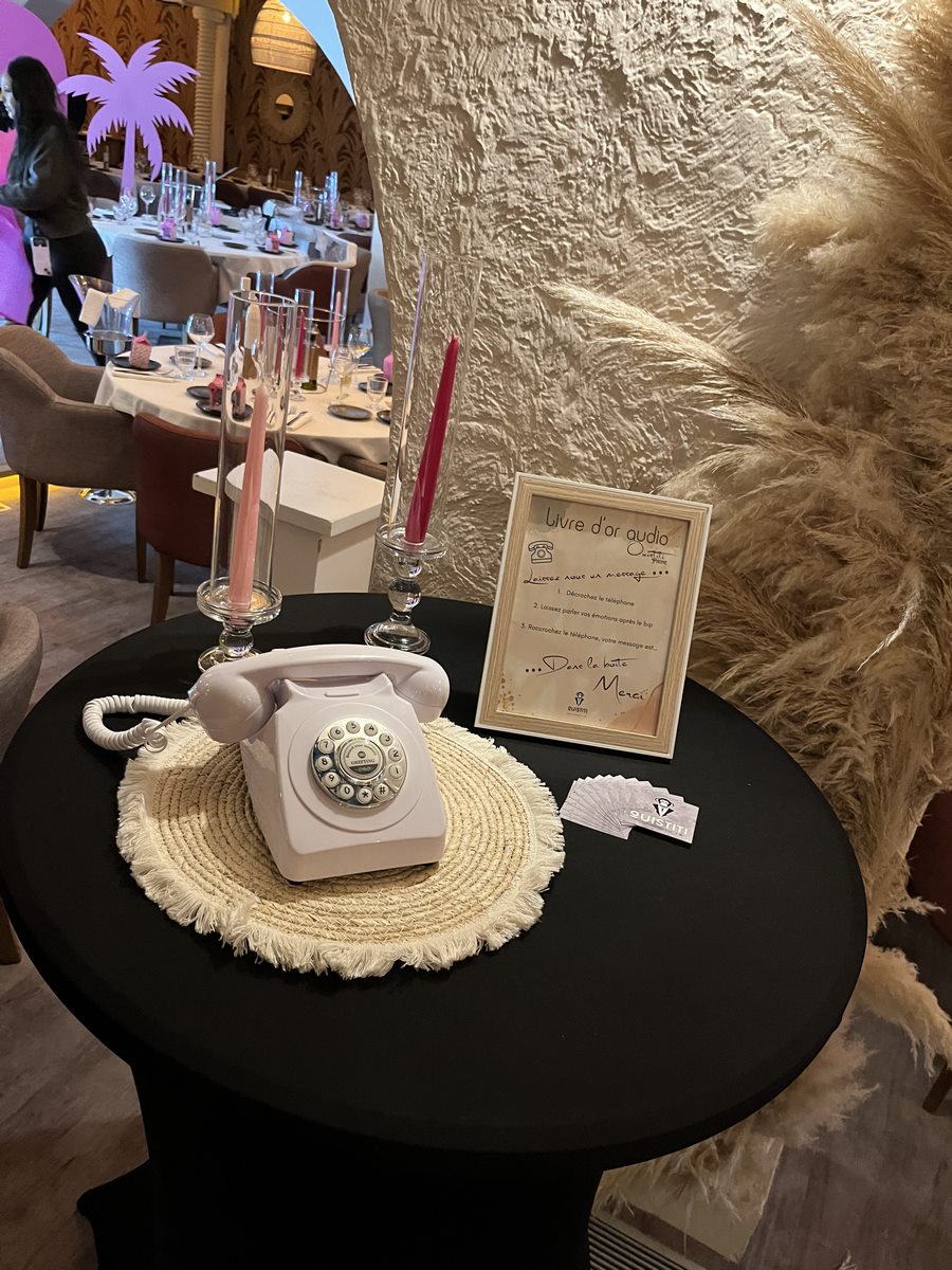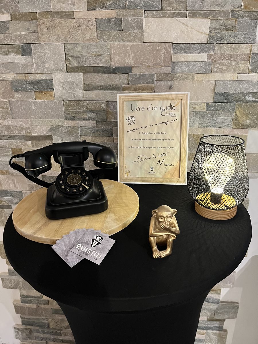 Il prend la forme d’un téléphone au design vintage qui s’intègre parfaitement dans tous les types d’évènements. Vos invités peuvent ainsi s’exprimer librement et spontanément en enregistrant leurs messages vocaux. Chaque mot, chaque rire, chaque émotion est capturée pour devenir un souvenir intemporel.